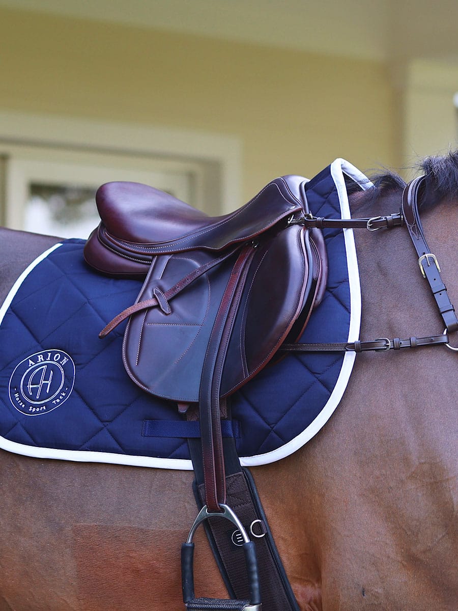 Experience the thrill of cross-country with the Arion Sellier saddle, handcrafted in France using premium French leather. Designed with leading eventing riders, it offers superior safety and connection. Customize your saddle with a choice of 3 seats and leather options. Features like Shoulder-Free Technology and Pro-Panel Reinforcement are available. Delivered in 6-8 weeks, with expert fitting included. Personalize it further with colored piping and a nameplate.
